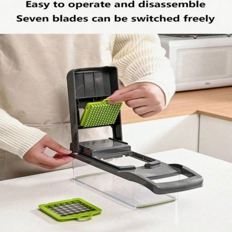 1 juego Cortador de verduras 14-en-1, 8 piezas de cuchillas de acero inoxidable y recipiente, adecua